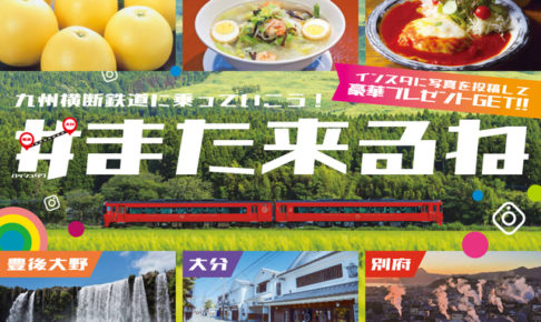 九州横断鉄道沿線都市観光協議会を構成する熊本、大分の6市(熊本市・八代市・大分市・別府市・豊後大野市・竹田市)の「景観」「グルメ」「観光施設」「アクティビティ」等の観光地の写真に「#また来るね」と「撮影した対象市名(#〇〇市)」の両方のハッシュタグをつけてインスタグラムに投稿。