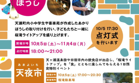 天ヶ瀬温泉街や日田市内の飲食店が出店し、「桜滝ライトアップ」を「食」とともに楽しんでもらえる1日限定特別イベントを開催します。