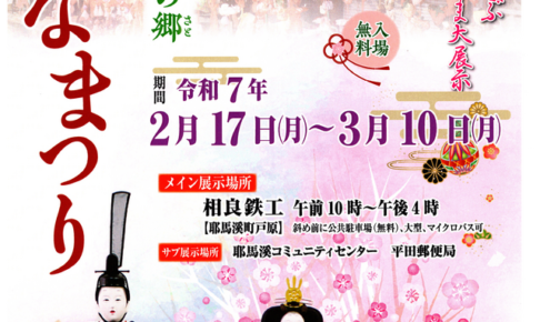 令和7年2月17日月曜日から令和7年3月10日月曜日まで、耶馬溪町戸原地区の『相良鉄工所』をメイン会場とし、他サブ会場2か所にて、第5回やばけいの郷ひなまつりが開催されます。