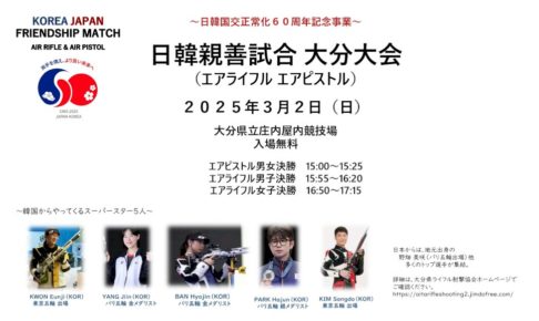 イベント内容日韓国交正常化60周年記念事業としてライフル射撃日韓親善試合大分大会が由布市(大分県立庄内屋内競技場)で下記のとおり開催されます。